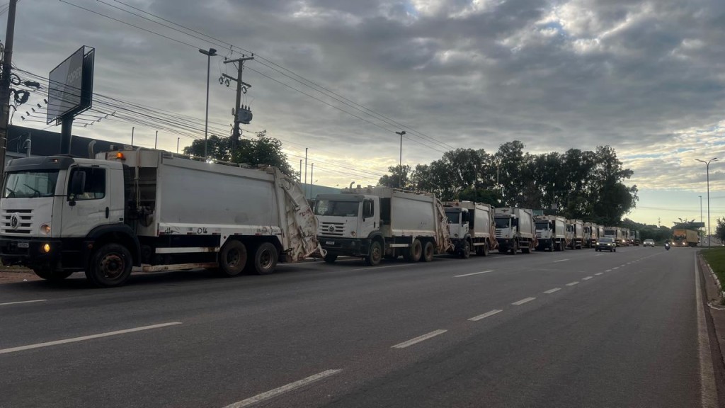 A imagem mostra os caminhões compactadores se deslocando para as rotas de coleta, logo nas primeiras horas da manhã, como parte do mutirão intensivo realizado neste domingo (25).