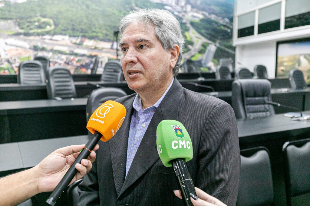 A foto mostra o secretário de Planejamento, Nivaldo Carvalho, vestido com traje social, concedendo entrevista a veículos de comunicação. O ambiente é o plenário da Câmara Municipal de Cuiabá. Ao fundo, é possível visualizar mesas pretas e cadeiras estofadas na cor preta.