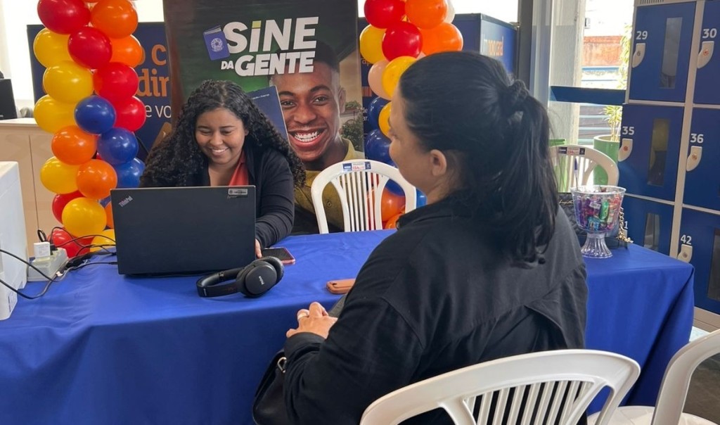 A imagem que ilustra a matéria mostra atendimento no Sine. Ao fundo destaca-se um banner do Sine Gente e balões coloridos.