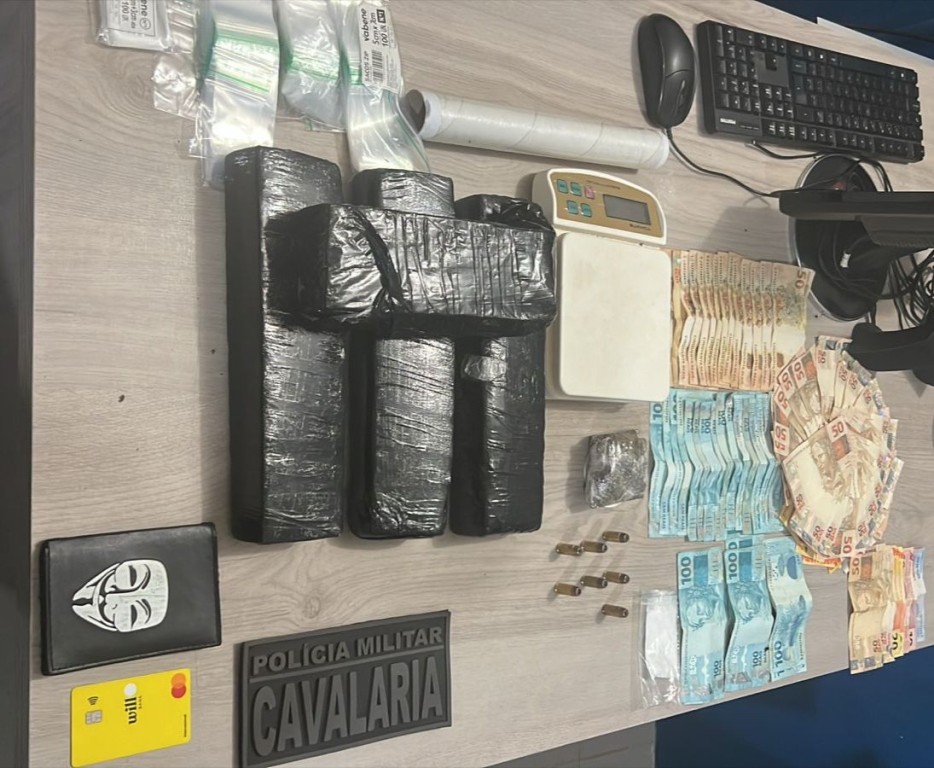 Os policiais iniciaram procedimento de abordagem e encontraram o suspeito. Na revista pessoal e vistoria no veículo, os militares localizaram a quantia de R$ 6.317,00 em dinheiro e porções de maconha e cocaína. Questionado pela PM, o suspeito afirmou ser integrante de uma facção criminosa responsável pela distribuição de drogas e recolhimento do dinheiro proveniente do tráfico de entorpecentes.