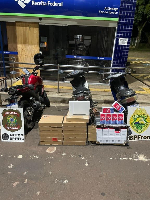 Na abordagem, foi constatado que os volumes continham computadores e aparelhos celulares sem a documentação legal. As motocicletas e os produtos foram encaminhados à Receita Federal para os procedimentos administrativos.