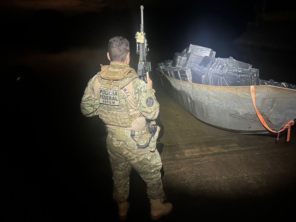 Foz do Iguaçu/PR. Em mais uma ação conjunta entre a Polícia Federal, Civil e Militar, na noite desta terça-feira (23/9), foi apreendido uma embarcação com dezenas de cigarros estrangeiros contrabandeados do Paraguai, no município de São Miguel do Iguaçu/PR.