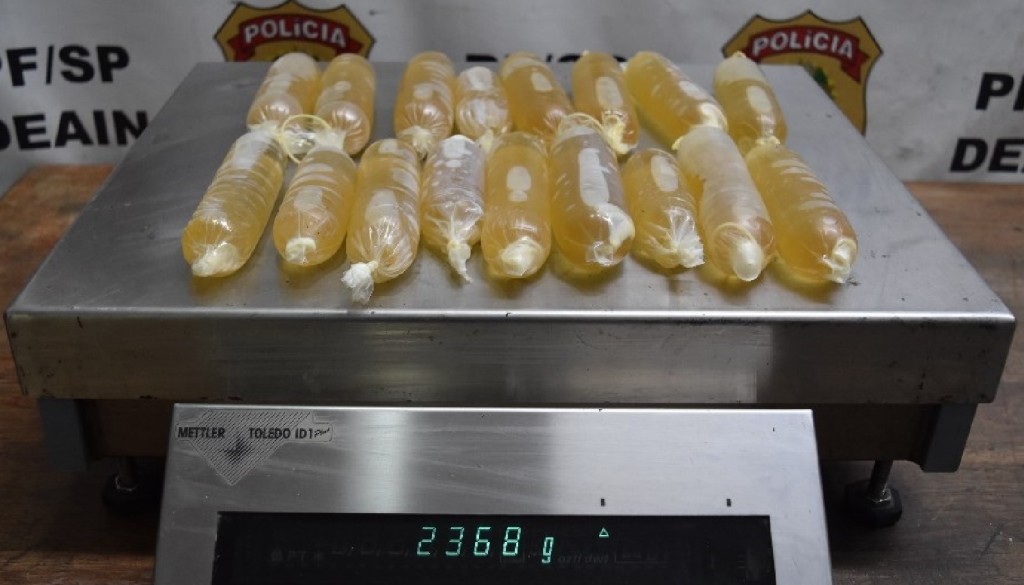 Guarulhos/SP. A Polícia Federal prendeu, nesta quinta-feira (15/5), no Aeroporto Internacional de São Paulo, em Guarulhos, uma passageira que transportava cocaína líquida em um voo internacional. A droga estava acondicionada em preservativos costurados ao sutiã que ela usava. Em outra ação, um homem com mandado de prisão em aberto foi capturado.