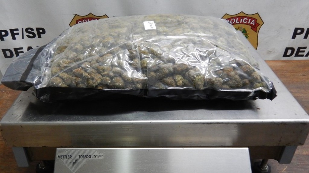 Já em outra operação, a PF flagrou dois passageiros – que haviam desembarcado de um voo procedente de Bangkok, Tailândia – com seis malas repletas de skunk.