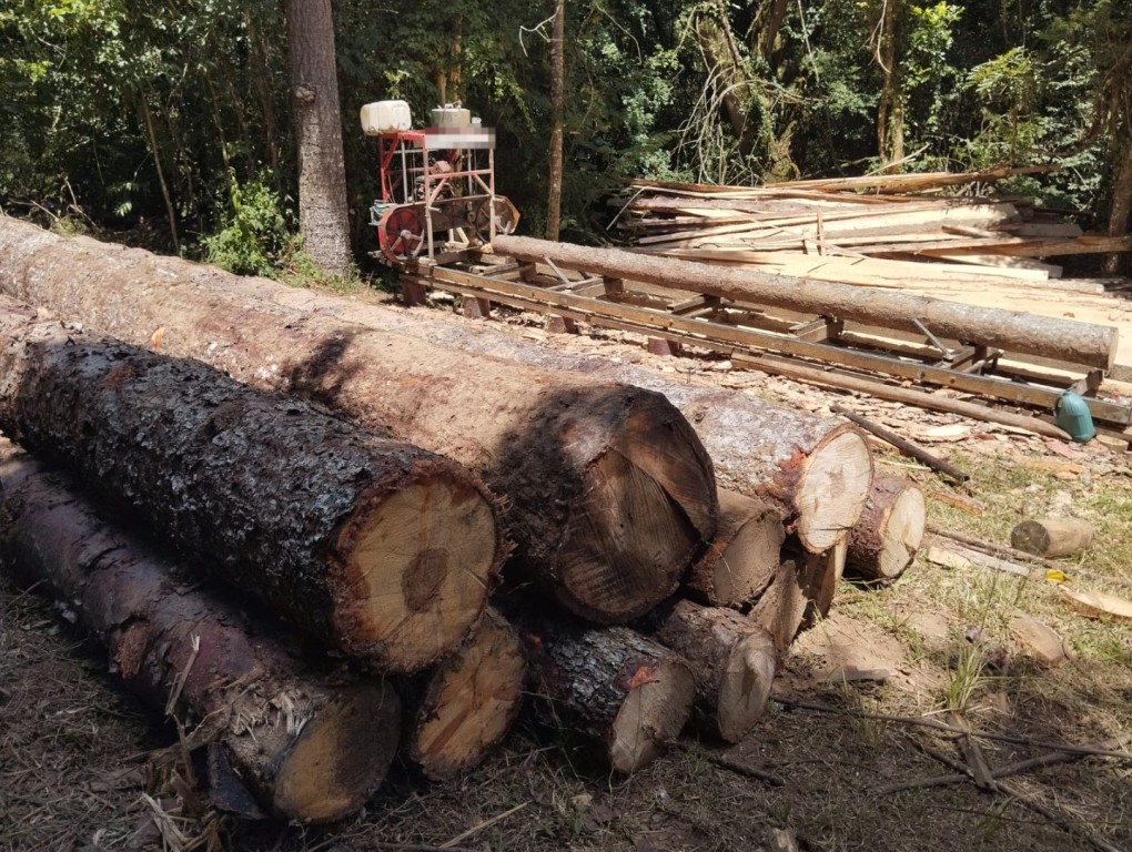 Durante patrulhamento rural integrado, as equipes identificaram atividade ilegal de extração de araucárias, espécie nativa, protegida por legislação ambiental federal e classificada como em risco de extinção. No local, foram encontradas pessoas operando equipamentos de serraria móvel para corte da madeira, sem a devida autorização dos órgãos competentes.