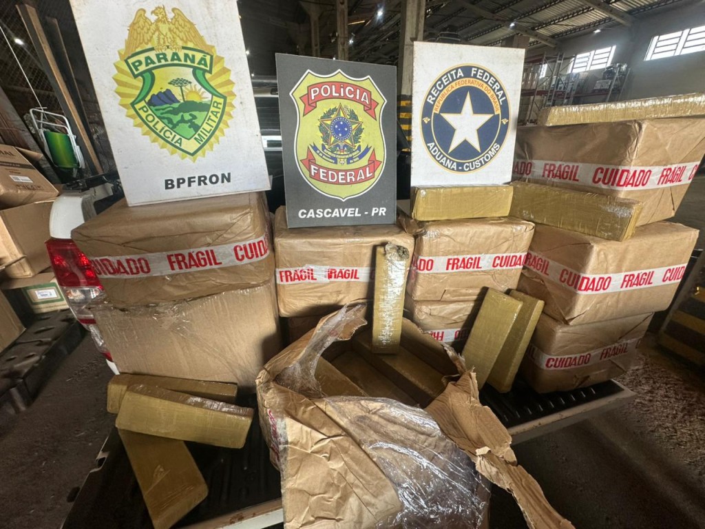 Cascavel/PR. Nessa terça-feira (28/4), uma ação integrada entre a Polícia Federal, a Receita Federal do Brasil e os policiais do BPFron resultou na apreensão de, aproximadamente, 140 kg de maconha e cerca de 20 caixas de cigarros contrabandeados em um depósito de transportadora.