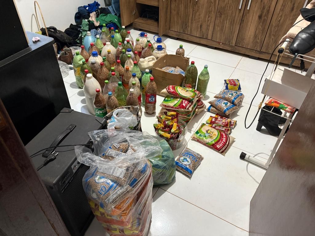 Dentro da residência, os policiais localizaram diversos alimentos, itens de higiene e de limpeza guardados em um armário, todos integrantes de cestas básicas distribuídas por programas sociais.