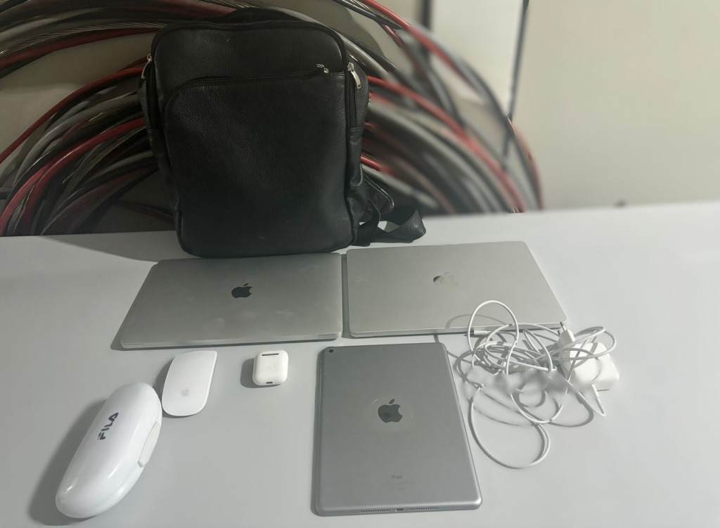 Os equipamentos – dois notebooks da marca Apple, um tablete, carregadores de celular e fones de ouvido foram encontrados na residência do suspeito do crime, no bairro Dom Aquino.
