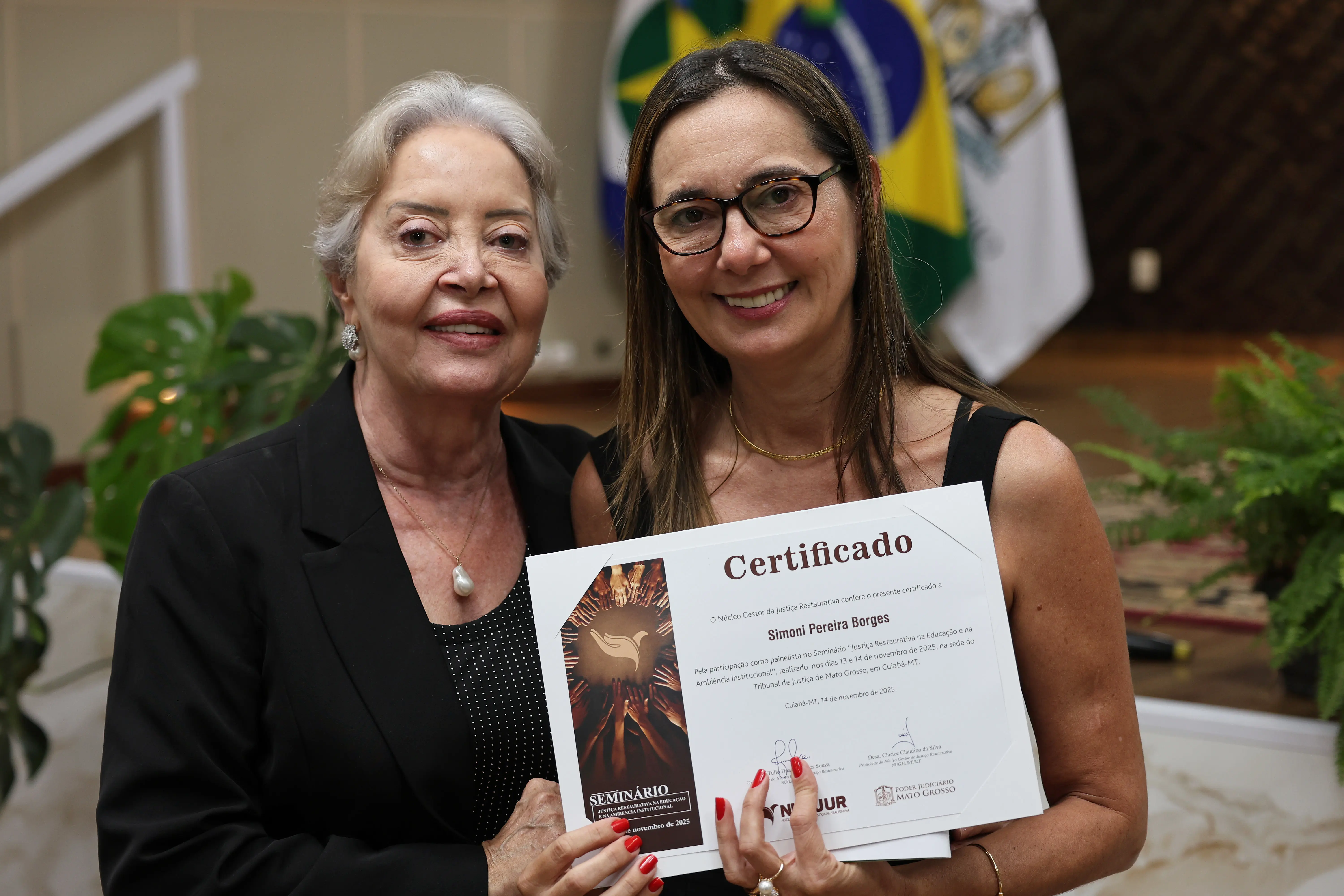 A secretária recebeu um certificado pela participação como palestrante no seminário, entregue pela desembargadora Clarice Claudino da Silva, presidente do NugJur. “Nós nos identificamos uns aos outros nos círculos de construção de paz, onde cada um é ouvido, é percebido na sua integralidade e não é julgado. Pelo contrário, é acolhido”, comentou a desembargadora.