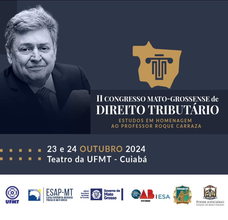 Será realizado na próxima semana, nos dias 23 e 24 de outubro, o “II Congresso Mato-Grossense de Direito Tributário – edição em homenagem a Roque Carrazza”. O evento terá lugar no Teatro da Universidade Federal de Mato Grosso, em Cuiabá, e a Escola Superior da Magistratura de Mato Grosso (Esmagis-MT) é uma das organizadoras. Fonte: Tribunal de Justiça de MT – MT