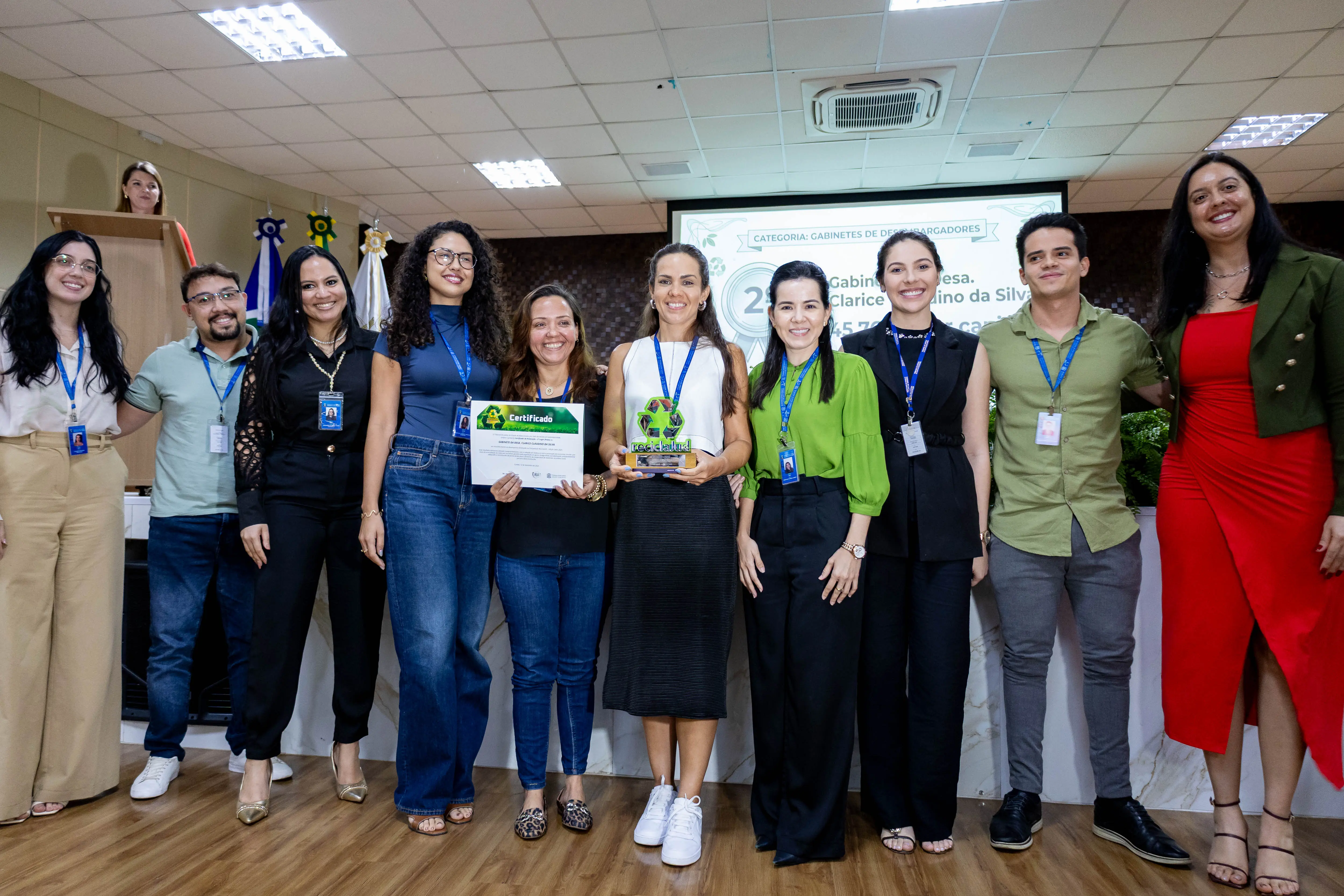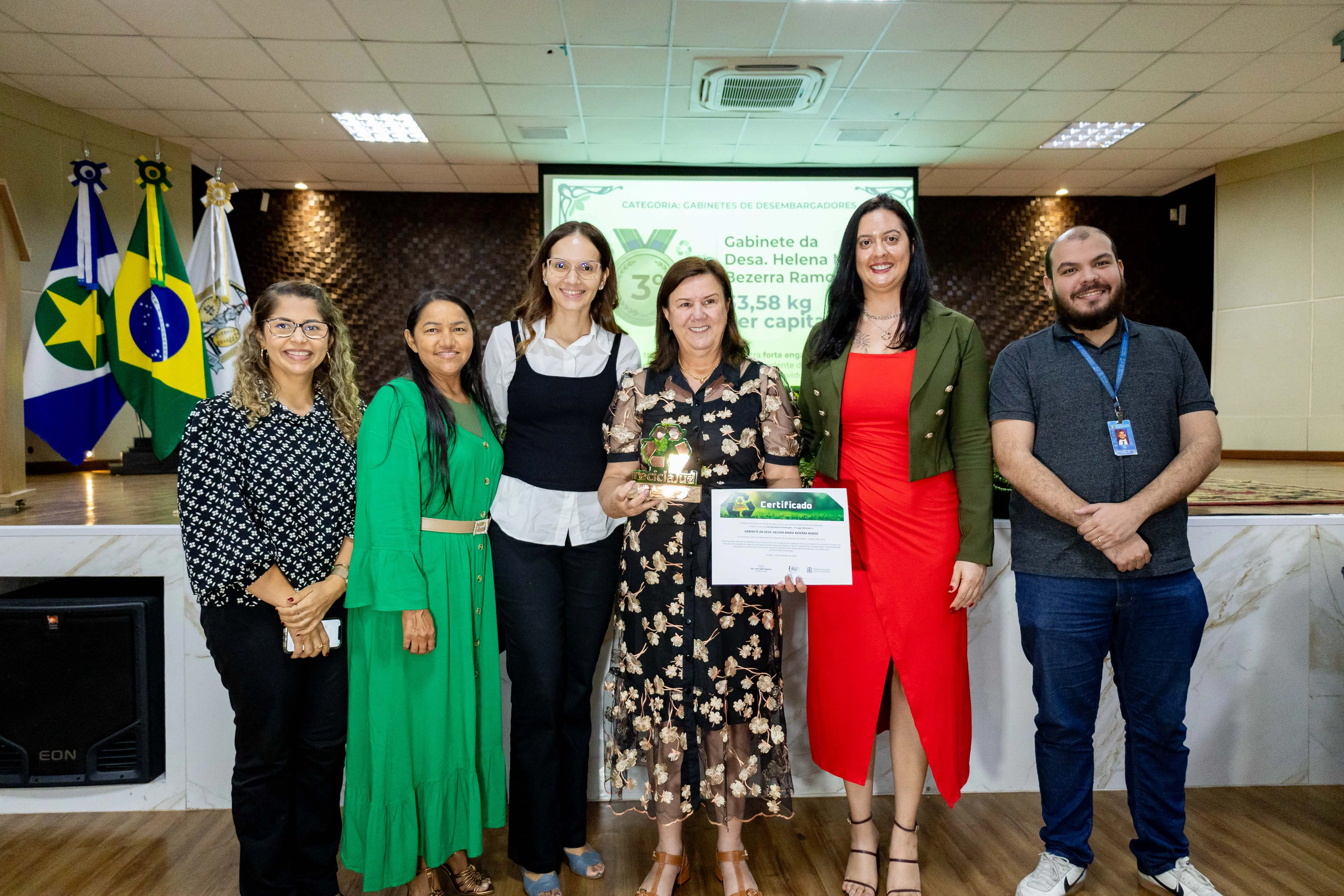 Durante a solenidade de premiação, a desembargadora Helena agradeceu o esforço coletivo e, em tom descontraído, afirmou que continuaria trazendo de casa materiais para reciclagem.
